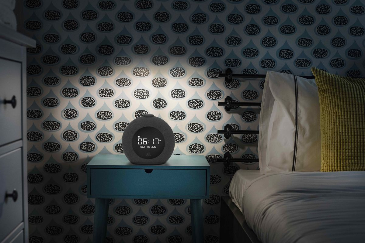 Okrągły i powleczony ładną tkaniną JBL Horizon 2 na początek nas obudzi. Budzik można zaprogramować tak, aby odtwarzał różne ścieżki dźwiękowe - radio albo sygnał cyfrowy - co więcej, daje możliwość ustawienia dwóch niezależnych alarmów o różnych godzinach.