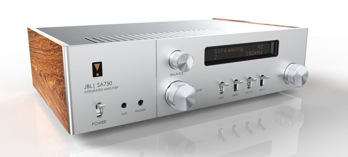 JBL SA750 jest wyposażony w panel przedni z frezowanego aluminium w stylu retro z eleganckimi pokrętłami głośności, balansu i źródeł oraz solidnymi przełącznikami zasilania, wyciszenia, direct, MC / MM phono i kalibracji pomieszczenia Dirac Live.