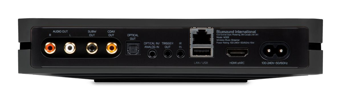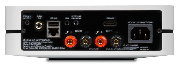 Bluesound POWERNODE obsługuje port HDMI eARC, dwuzakresowe Wi-Fi i gigabitowy Ethernet, Apple AirPlay 2, odbiornik i nadajnik Bluetooth aptX HD, RCA, optyczne Toslink, jack 3,5 mm oraz USB typ A.