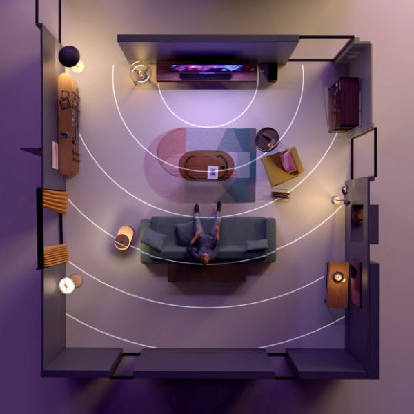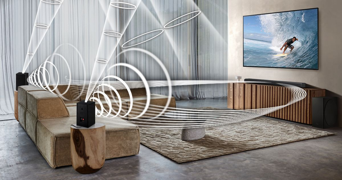 Wielokanałowy Dźwięk Przestrzenny w formacie 3.1.2 oznacza z kolei, że soundbar ma 3 kanały równomiernie rozprowadzające dźwięk: 1 niskotonowy i 2 skierowane ku górze, które sprawiają, że brzmienie otacza nas z każdej strony.