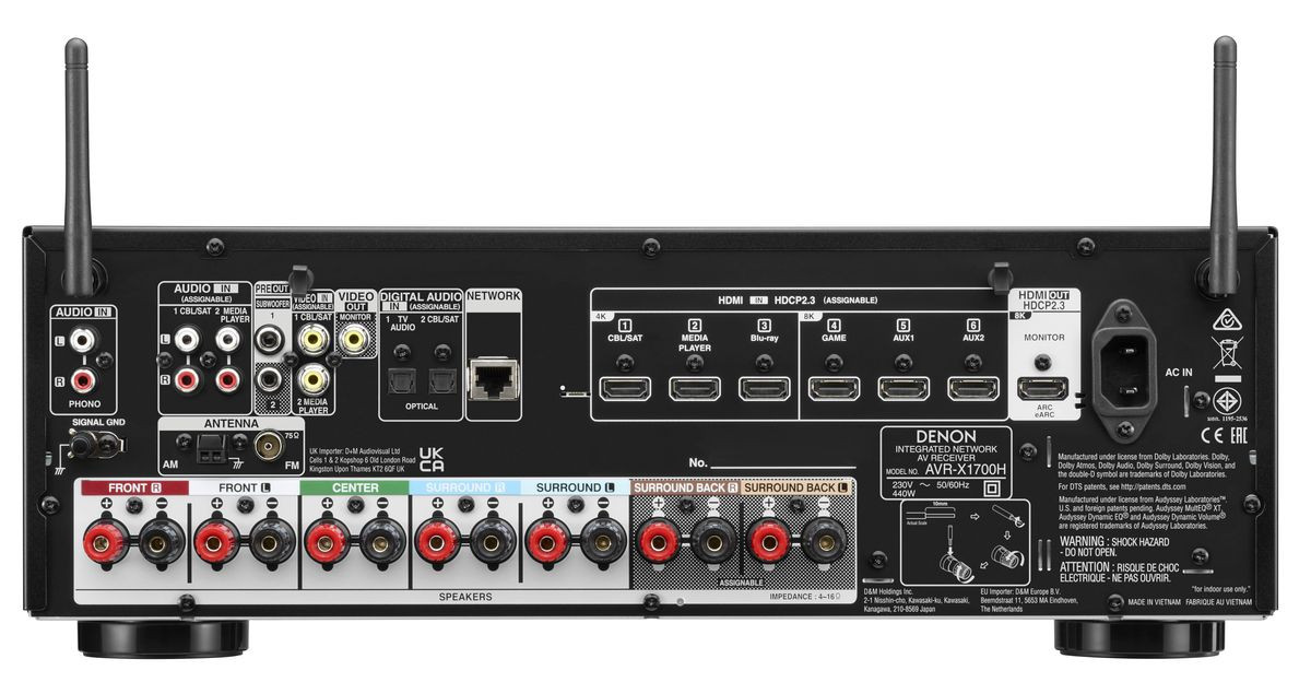 Denon AVR-X1700H został wyposażony w siedem kanałów wzmocnienia o mocy 145W na kanał. Obsługuje najnowsze formaty dźwięku przestrzennego, w tym Dolby Atmos, Dolby Atmos Height Virtualization Technology, DTS:X i DTS Virtual:X.