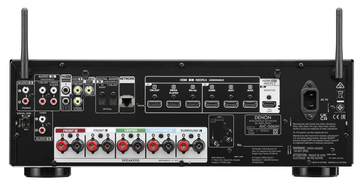 AVR-S660H oferuje najnowsze i zaawansowane specyfikacje HDMI, takie jak obsługa rozdzielczości obrazu 8K/60Hz i 4K/120Hz na trzech wejściach HDMI do 40Gbps, Dolby Vision, HDR10, HDR10+, Dynamic HDR i HLG, a także skalowanie do 8K oraz kompatybilność z HDCP 2.3 na wszystkich wejściach HDMI (6 wejść / 1 wyjście). Do dyspozycji jest platforma multiroom do bezprzewodowego streamingu muzyki HEOS Built-in.