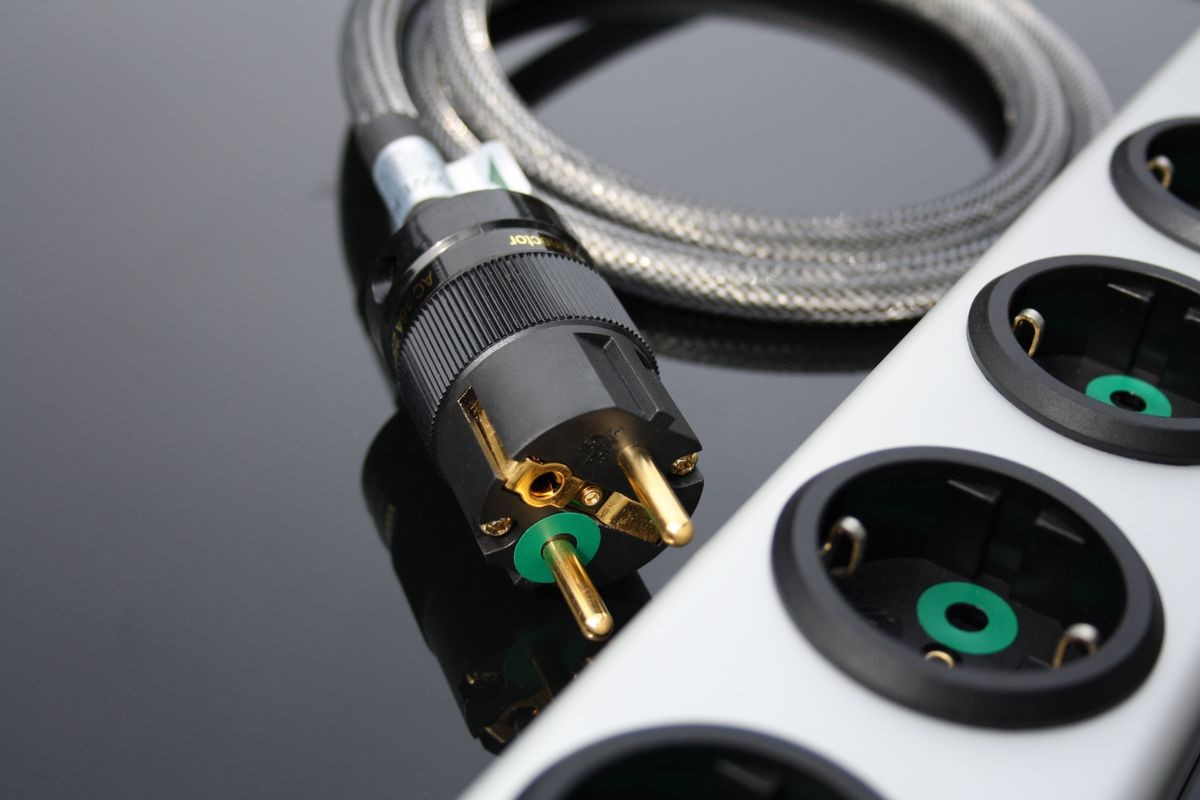 Wielokrotnie ekranowany przewód sieciowy (3G / 2,5 mm²) w oplocie z włókna węglowego posiada masywny wtyk z pozłacanymi lub rodowanymi powierzchniami kontaktowymi.