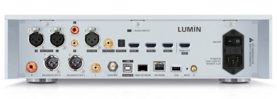 Lumin P1 jest wyposażony w bogaty zestaw wejść - dla sygnałów analogowych XLR oraz RCA, zaś dla cyfrowych AES/EBU, koaksjalne, optyczne, USB oraz trzy HDMI. Wyjścia analogowe są w postaci symetrycznej XLR oraz niesymetrycznej RCA.
