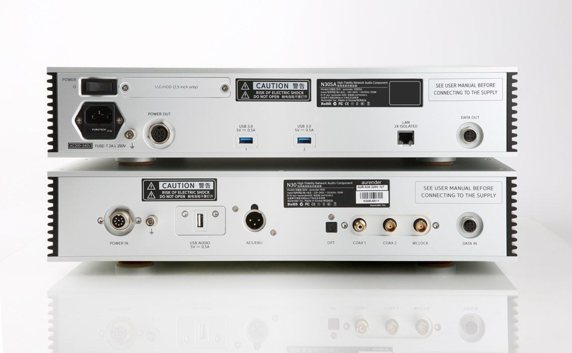 Elektronikę Aurendera N30SA rozdzielono między dwie obudowy; w jednej znajduje się zasilacz, serwer (z macierzą dyskową), w drugiej – sekcja audio. Ta ostatnia ogranicza się jednak do platformy cyfrowej, ponieważ N30SA nie ma wbudowanego przetwornika C/A – dostępne są jedynie wyjścia cyfrowe, które wyślą na zewnątrz sygnały PCM 32 bit/384 kHz oraz DSD512, a N30SA potrafi odtworzyć pliki zgodne z takimi wytycznymi.