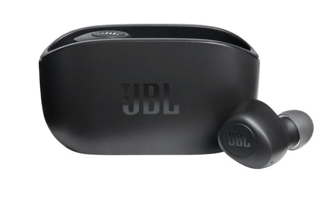 JBL Wave 100 TWS skrywają 8 mm przetworniki. Pracują (wraz z zapasem w etui ładującym) nawet 20 godzin, współpracują też z asystentem głosowym, z którym można się połączyć za pomocą przycisku na słuchawce.