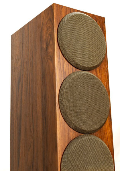 Ich kolor jest uzależniony od wykończenia obudowy – czarny materiał transparentny akustycznie wykorzystano w przypadku czarnych kolumn, a ciemnobeżowy, wpadający w starzone złoto, w przypadku orzechowych.
