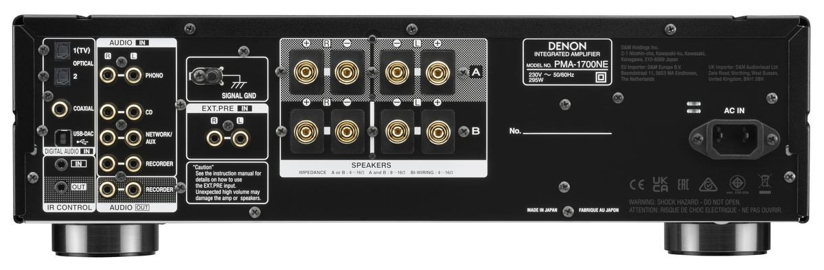 Denon PMA-1700NE zapewnia również odtwarzanie muzyki cyfrowej o wysokiej rozdzielczości do 11.2 MHz DSD i 384-KHz/32-bit z komputera przy użyciu wejścia USB-B, połączonego z precyzyjnym zegarem głównym i wysokowydajnym przetwornikiem cyfrowo-analogowym, który tłumi zakłócenia jitter gwarantując najlepszą wydajność podczas odtwarzania sygnału cyfrowego. Wyjścia obejmują terminale głośników A/B, a także wyjście subwoofera.