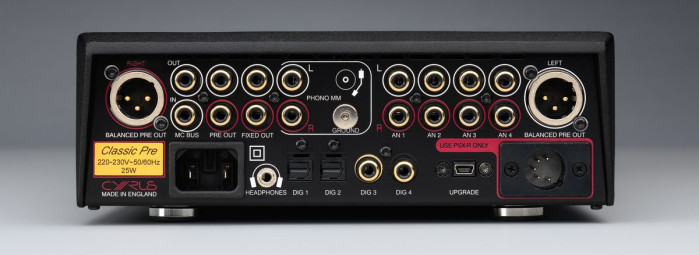 Cyrus Classic PRE zawiera port umożliwiający podłączenie zasilacza PSX-R. Dodatkowe zasilanie z PSX-R jest kierowane do stopni analogowych przedwzmacniacza. Takie rozwiązanie zapewnia stabilne i niskoszumowe zasilanie analogowych stopni przedwzmacniacza i filtru analogowego w obwodzie przetwornika C/A.