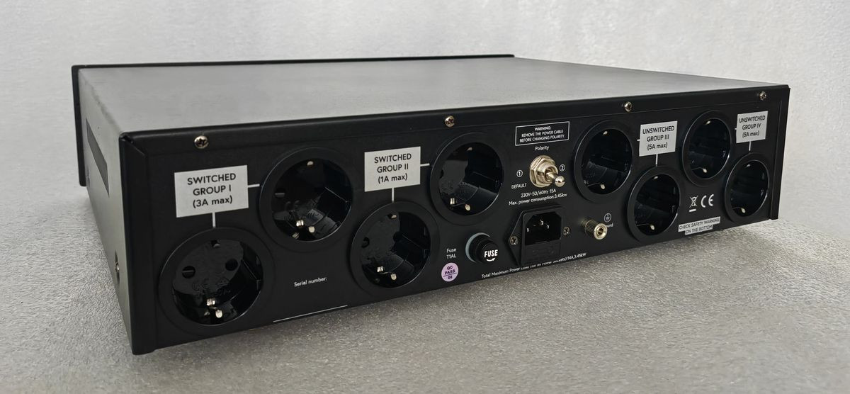 • Niezależne grupy przełączanych i nieprzełączanych gniazd zasilania (typu Schuko) specjalnie zaprojektowanych do użytku z różnymi urządzeniami audio i wideo;