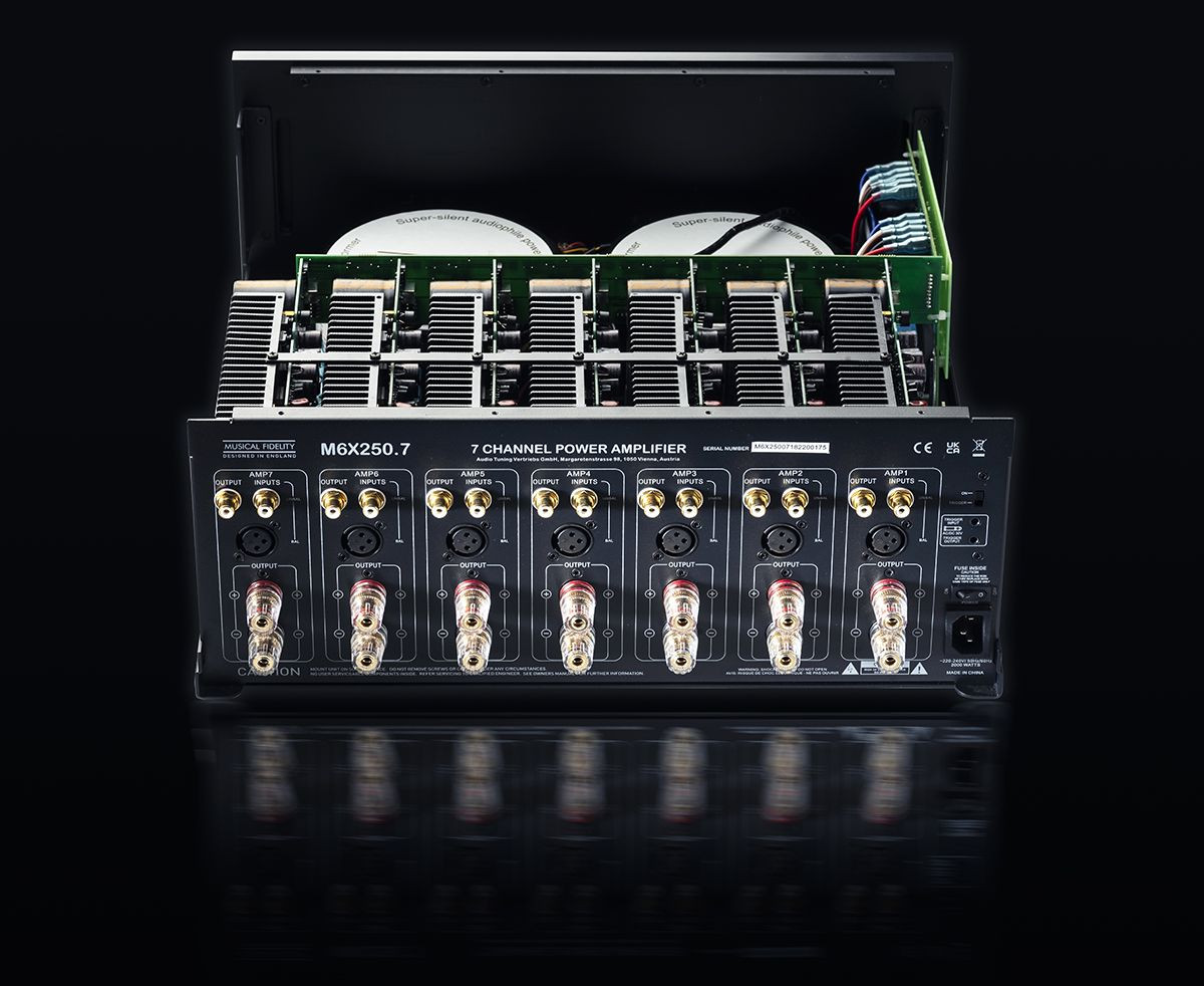 Bardzo ciche audiofilskie transformatory dystrybuują czystą moc, zapewniając - jak mówi producent - bardzo wysoki zakres dynamiki i szczegółową scenę dźwiękową. Dzięki konstrukcji Musical Fidelity M6X 250.7 nie potrzebuje wentylatora, aby utrzymać tranzystory końcowe w odpowiedniej temperaturze.