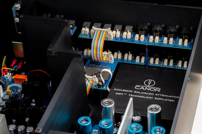 Zarówno precyzyjnie zbalansowany potencjometr, jak i część elektroniczną przedwzmacniacza Canor Audio Hyperion P1 zamontowano na podkładkach antywibracyjnych. Potencjometr umieszczono w specjalnej, wytrzymałej aluminiowej obudowie o ściankach grubości 10 mm, która zapewnia doskonałe ekranowanie oraz pochłania drgania.