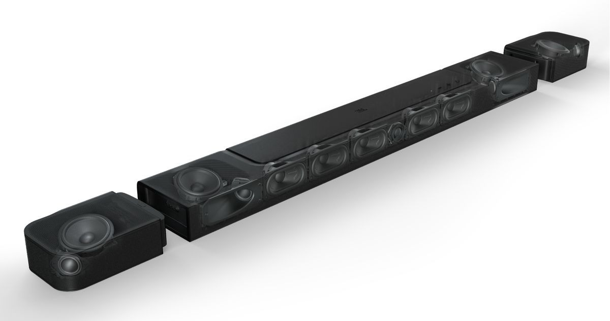 JBL Bar 1000 jest wyposażony w technologię MultiBeam i cztery przetworniki skierowane w górę - dwa w soundbarze i dwa w odłączanych, zasilanych akumulatorowo głośnikach surround - dzięki czemu otacza nas sferą dźwięku przestrzennego Dolby Atmos i DTS:X 3D z szeroką, przestrzenną sceną dźwiękową bez konieczności prowadzenia dodatkowych kabli.