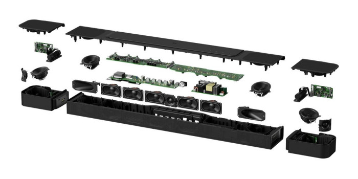 • Soundbar: 5 x (46x90) mm przetworniki typu racetrack, 3 x 0,75” (20 mm) głośniki wysokotonowe, 2 x 2,75” (70 mm) przetworniki skierowane w górę