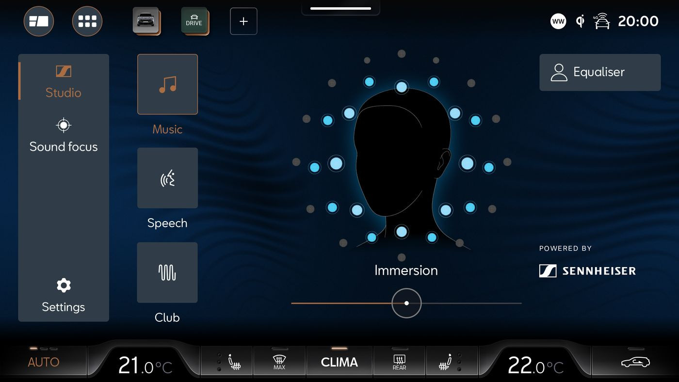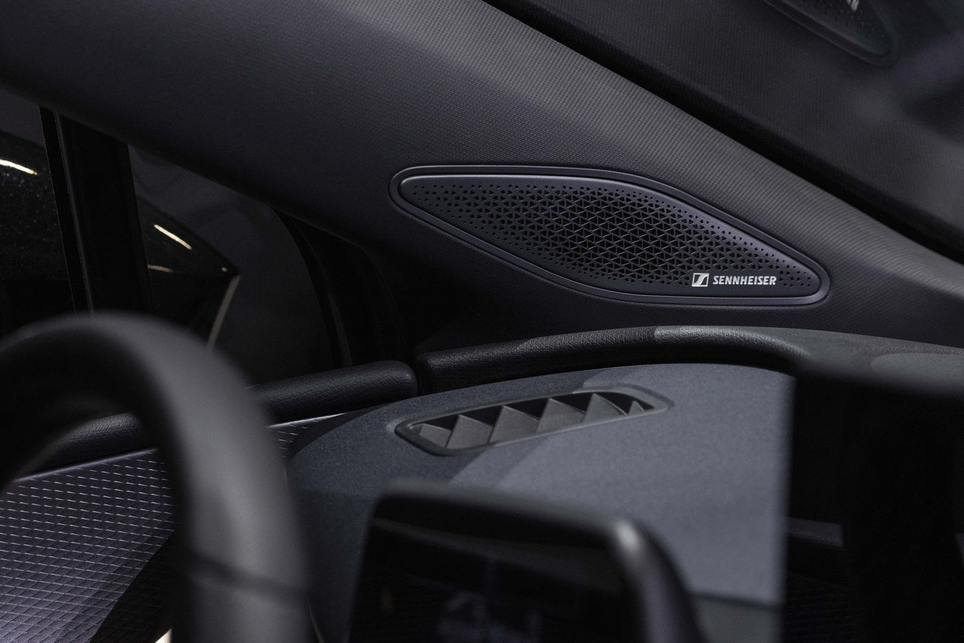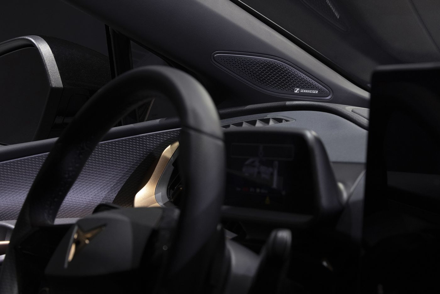 CUPRA Tavascan otrzymał wysokiej jakości 12-głośnikowy system audio, Sennheiser zaproponował funkcję AMBEO Concerto, swoją najnowszą innowację w zakresie oprogramowania zapewniającego wciągający dźwięk.