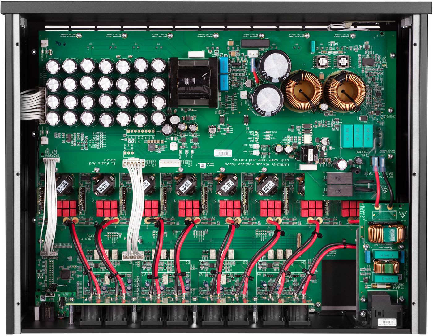 8 wzmacniaczy Purifi o łącznej mocy wyjściowej 3,2 kW i jeszcze wyższej mocy szczytowej stanowi niezwykle duże wyzwanie dla zasilania, co często jest czynnikiem ograniczającym w przypadku popularnych wzmacniaczy wielokanałowych.
