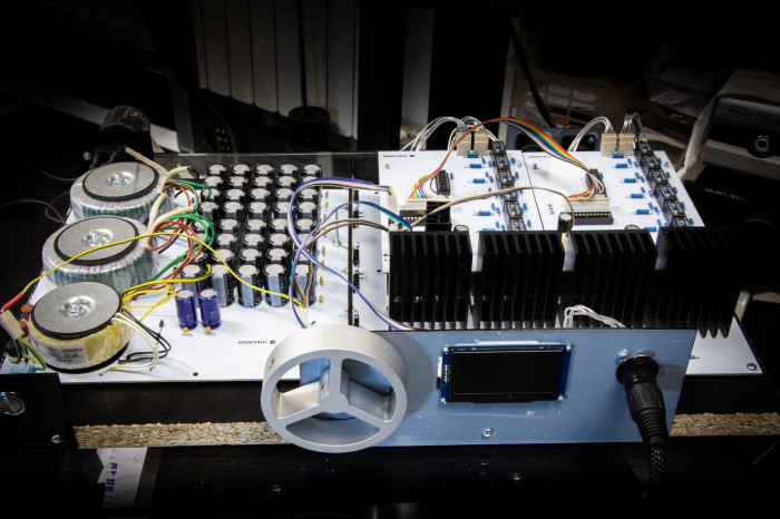 W jego wnętrzu znajdziemy trzy transformatory toroidalne oraz kondensatory stabilizujące napięcie o łącznej pojemności 44.000 uF na kanał. Natomiast wyświetlacz liniowy i cyfrowo sterowana 80-stopniowa regulacja głośności, która jest realizowana poprzez przekaźniki, wnosi do konstrukcji odrobinę szyku XXI wieku.