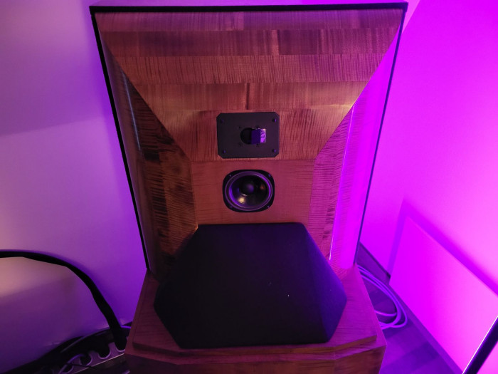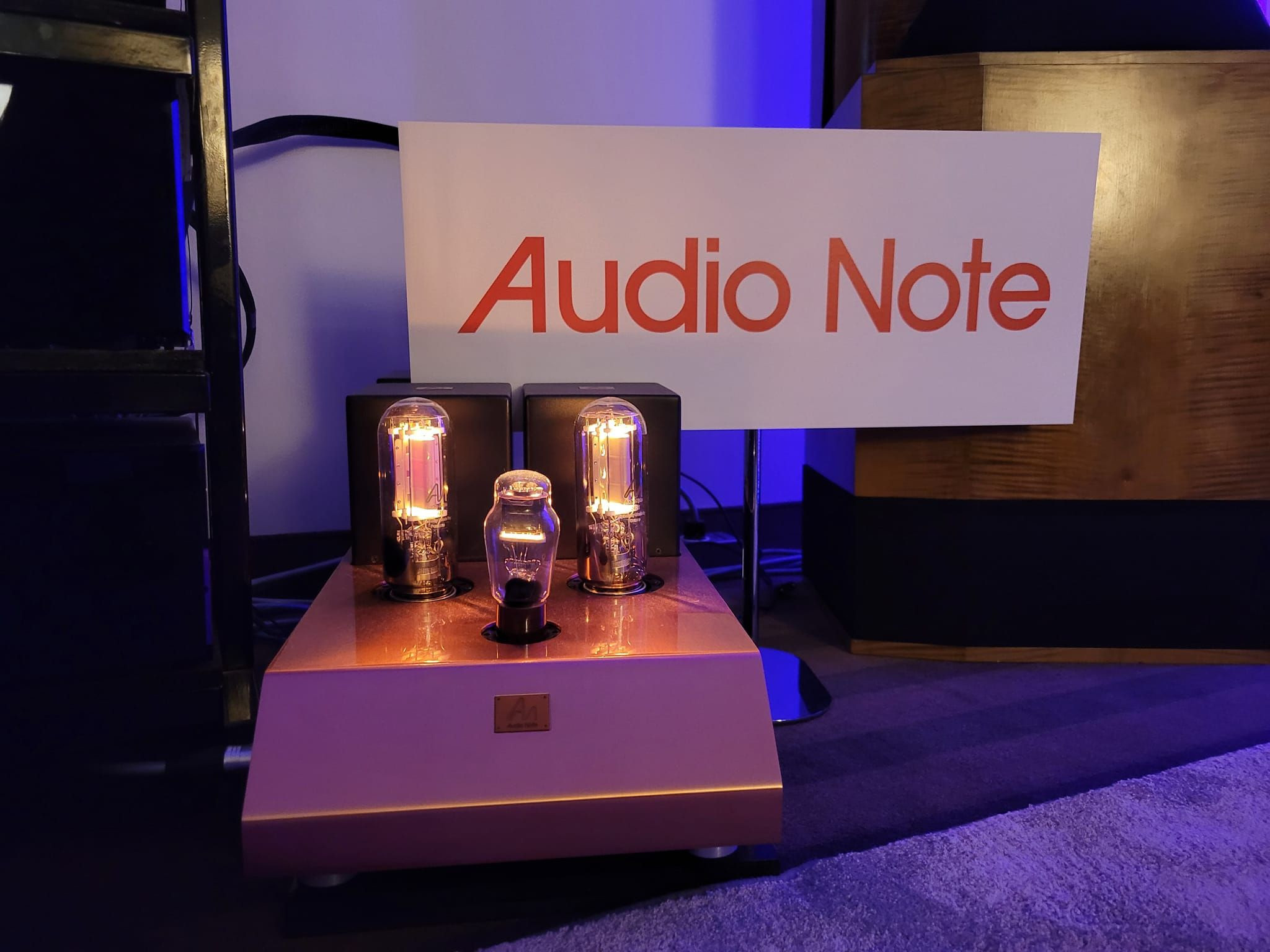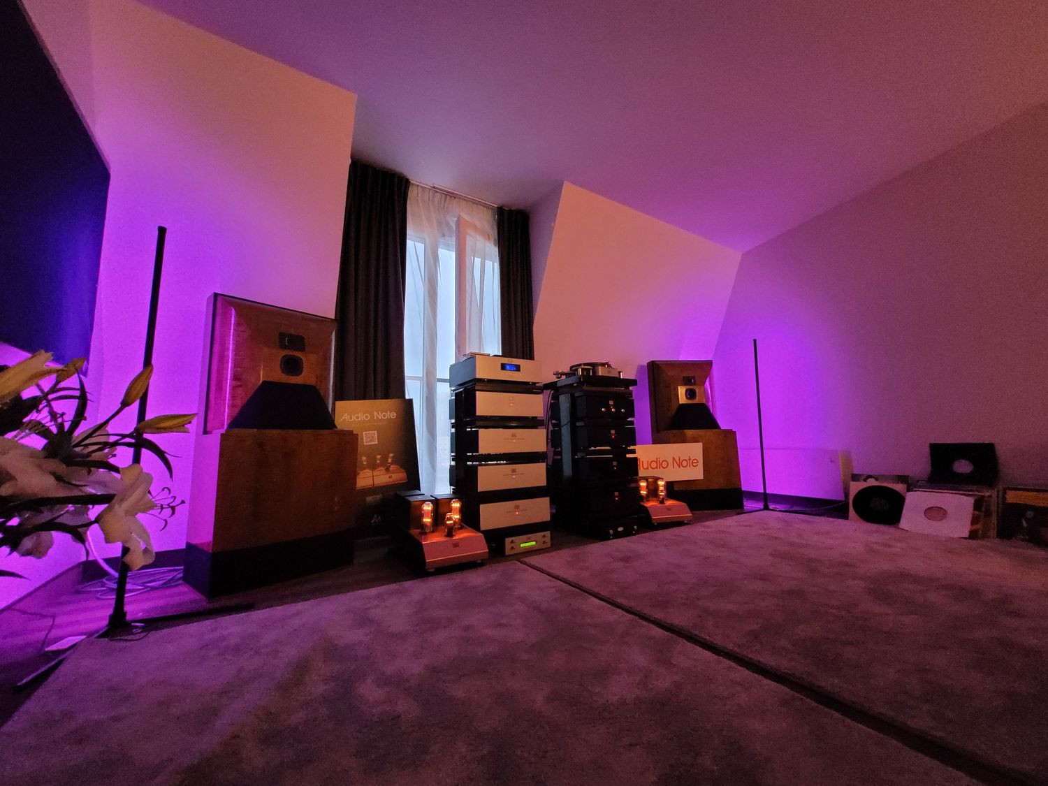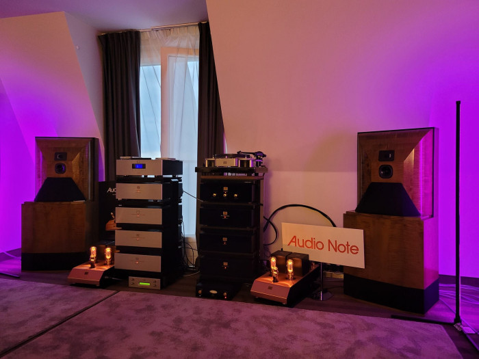 Poszczególne stopnie wzmocnienia są oddzielone srebrnymi transformatorami. Sygnał przekazują 93-decybelowe kolumny głośnikowe Type-A wykonane z drewna. Wszystko zostało połączone i zasilane srebrnymi kablami Audio Note. Gramofon, jaki wykorzystano w prezentacji to 3-silnikowy TT-3 II Reference z wkładką MC z elektromagnesem w generatorze zasilanym swoim niezależnym układem.