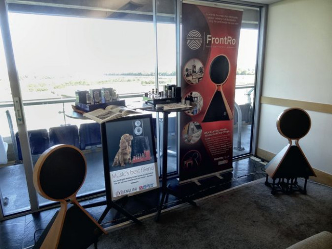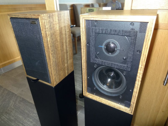 Niewielkie zespoły głośnikowe FrotRo to najmniejsza konstrukcja hybrydowa – łącząca elektrostatyczny przetwornik średnio-wysokotonowy (w okrągłej ramce) i otwartą odgrodę z przetwornikiem dynamicznym (trójkąt na dole). Potężnego basu nie było ale… środek i góra urzekały gładkością i słodyczą damskich wokali.