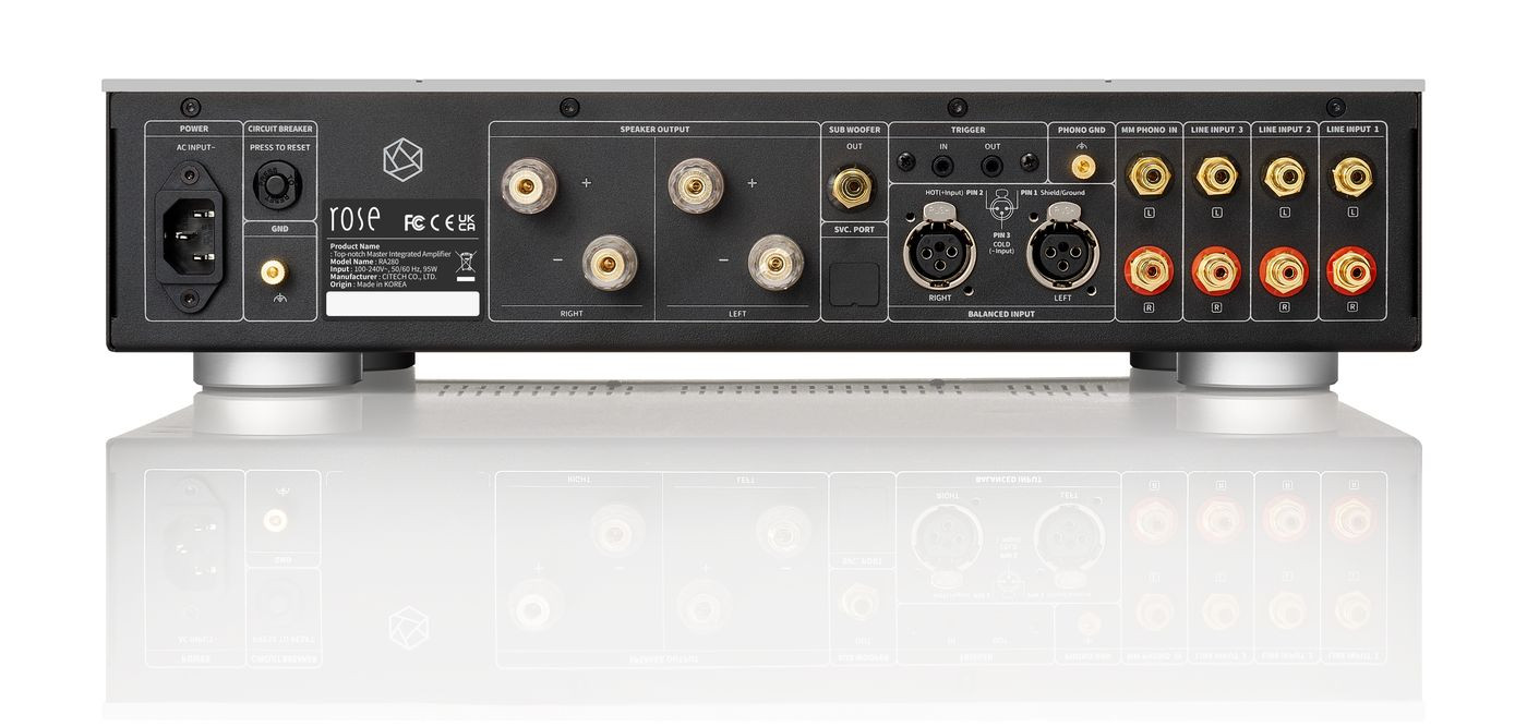 Rose RA280 umożliwia korzystanie z różnorodnych urządzeń źródłowych. Na jego tylnej ściance znajdują się wejścia zbalansowane (2 × XLR) oraz 3 wejścia niezbalansowane (2 × RCA). Do tego wyjście na subwoofer oraz wbudowany przedwzmacniacz gramofonowy kompatybilny z modelami wyposażonymi we wkładkę typu MM.