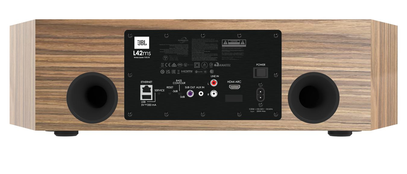 Złącza audio obejmują dwa zestawy analogowych wejść stereo (jedno wejście typu RCA i jedno wejście 3,5 mm) wraz z jednym HDMI-ARC do podłączenia do telewizora. JBL L42 MS Classic może też odtwarzać strumieniowane treści poprzez przewodowe lub bezprzewodowe połączenie sieciowe za pośrednictwem Spotify Connect, Apple Airplay2 i Google Chromecast lub łączyć się z urządzeniem bezpośrednio przez Bluetooth.