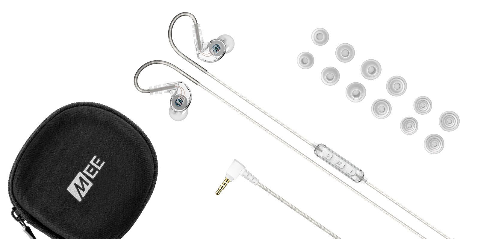MEE AudioM6 R3 mają elastyczne przewody, które idealnie dopasowują się do anatomii uszu i mają się w nich trzymać bez sprawiania dyskomfortu. Są wyposażone w zintegrowany mikrofon i pilot pozwalający na odbieranie połączeń telefonicznych, kontrolę odtwarzania muzyki i regulację głośności bez konieczności wyciągania telefonu.