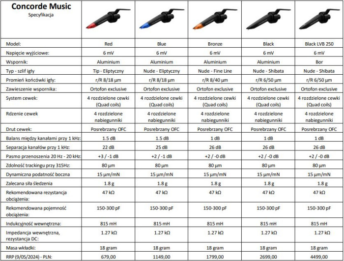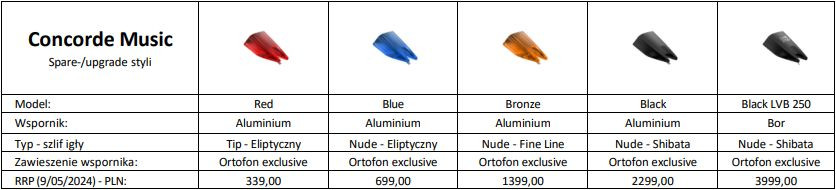 Wszystkie igły stosowane we wkładkach serii Ortofon Concorde Music są kompatybilne ze wszystkimi korpusami wkładek. Oznacza to, że rozpoczynając swoją przygodę z Concorde Music Red możemy z czasem ulepszyć ją przez wymianę igły do dowolnej wkładki serii, a nawet do modelu Black LVB 250.