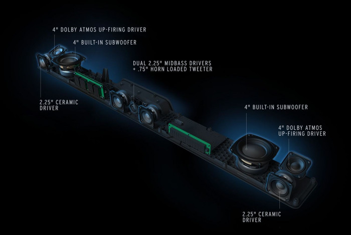 Soundbar jest niewielki (ma 71 cm długości) i oferuje przetworniki o średnicy 5,7 cm (2,25") oraz dwa wbudowane subwoofery o średnicy 10 cm (4").