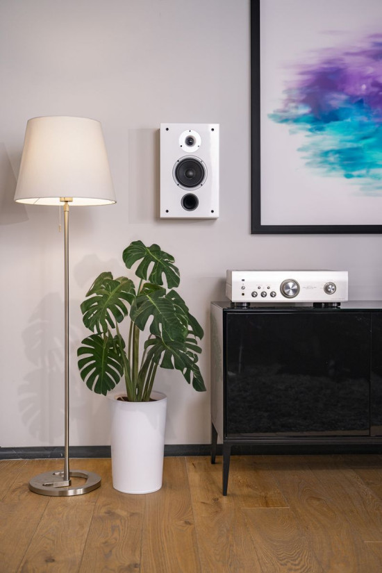Metalowe zaciski przewodów głośnikowych zostały wygodnie umieszczone w gnieździe na tylnej ściance. Montaż ułatwia obecność metalowego uchwytu z otworem montażowym – wystarczy tylko dobrać odpowiednie śruby do posiadanych ścian.