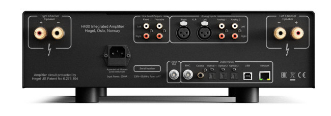 Hegel H400 ma na pokładzie trzy wejścia analogowe – dwa RCA i zbalansowane XLR, a także - w sekcji cyfrowej - wejście USB, dwa wejścia koaksjalne i trzy optyczne.
