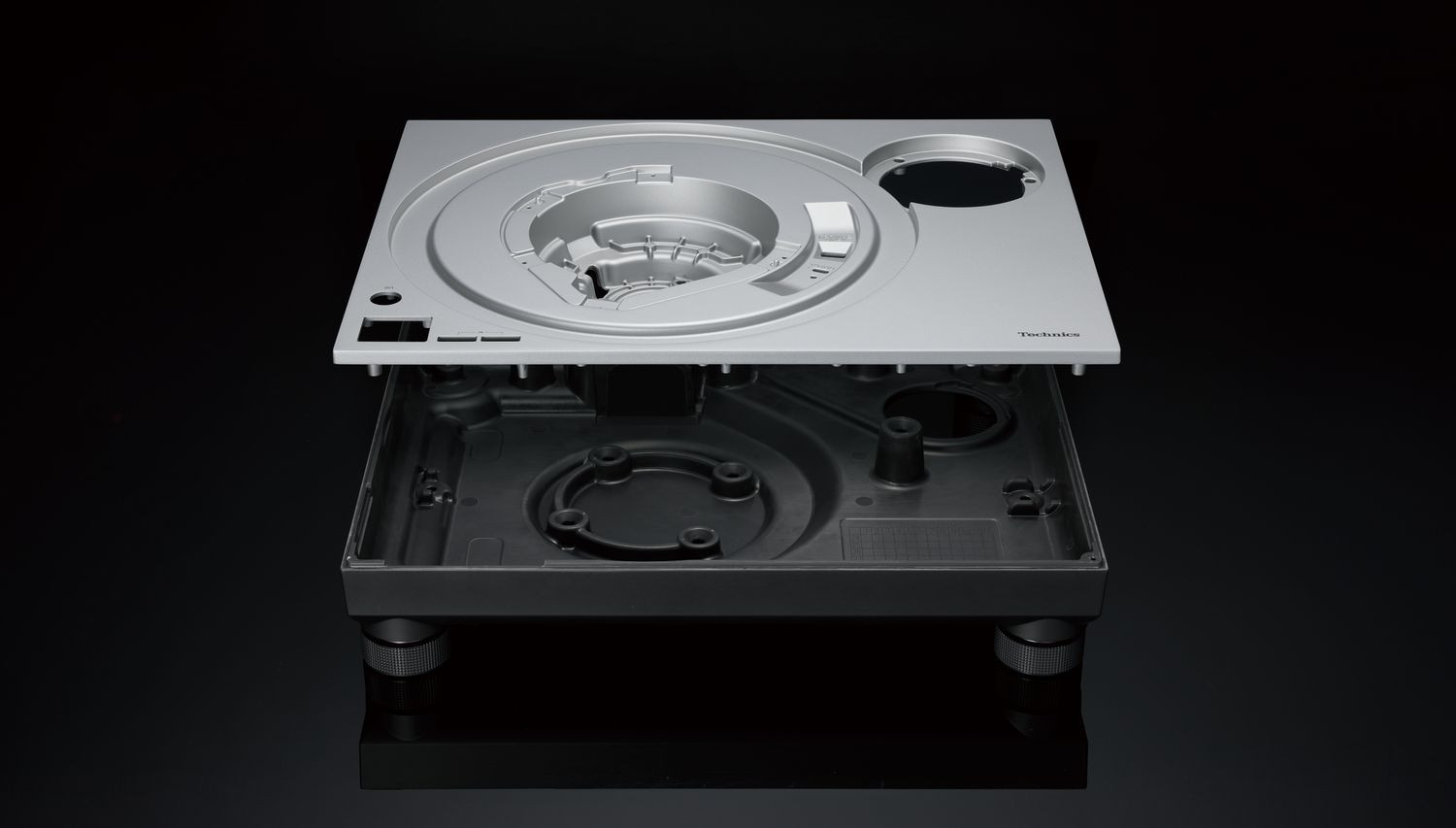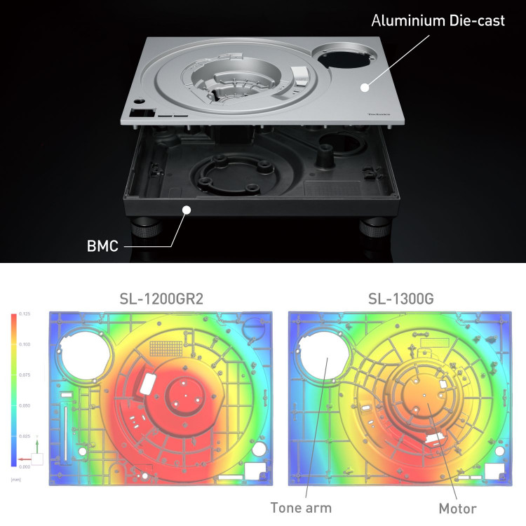 W modelu Technics SL-1300G zwiększono grubość odlewu aluminiowego, z którego wykonany jest chassis, aby zapewnić większą sztywność, co przyczynia się do lepszego tłumienia wibracji. Dodatkowo, na spodzie chassis, pomiędzy silnikiem a ramieniem, zaprojektowano dokładną strukturę żeber, która skutecznie oddziela mechaniczne wibracje silnika od ramienia, zapewniając niezakłócony proces śledzenia, co przekłada się na najwyższą wierność dźwięku.