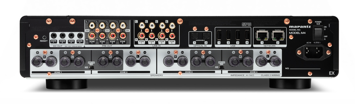 Model M4 zapewnia łączną moc wyjściową 800 W, co ma napędzić wymagające głośniki w czterech oddzielnych pomieszczeniach. Aby uzyskać jeszcze większą moc, M4 można zmostkować, aby dostarczyć do czterech kanałów 200 W i opcjonalnie sparować z wbudowanymi wzmacniaczami mocy w każdym pomieszczeniu. Można nawet podłączyć go do czterech aktywnych subwooferów za pomocą tych samych gniazd wyjściowych.