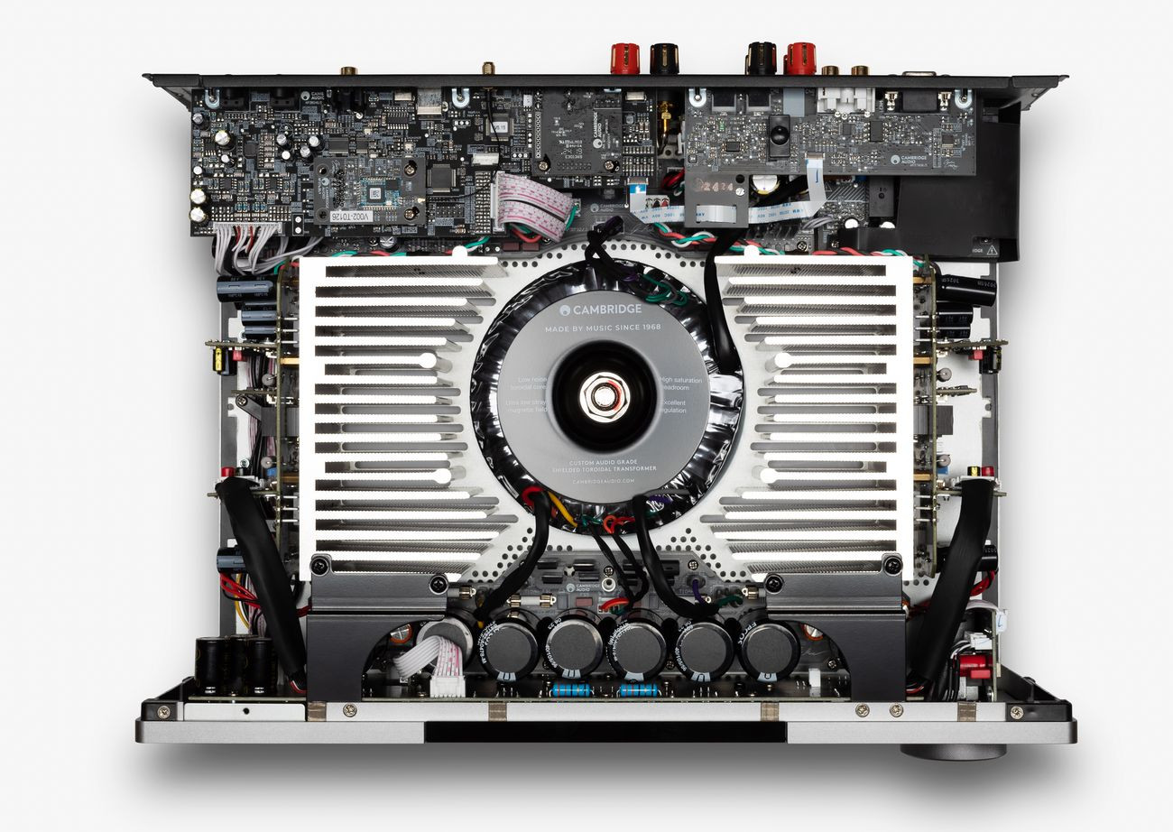 W Cambridge Audio EXA100 zastosowany specjalny transformator toroidalny, silnie ekranowany, supercichy i otoczony przez polerowane radiatory, widoczne przez wycięcia w górnej ściance. Moduły sekcji mocy bazują na rozwiązaniach zastosowanych w końcówce mocy Edge M.