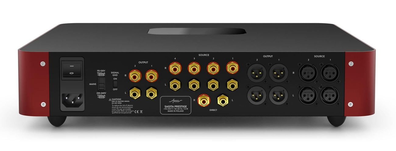 Model wyposażono w cztery wejścia RCA (w tym jedno direct) oraz dwa zbalansowane XLR, a także w dwie pary wyjść RCA i XLR. Dzięki temu Sagita Prestige EVO sprawdzi się w klasycznych systemach stereo.