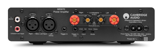 Cambridge Audio MXW70 został wyposażony zarówno w wejścia stereo RCA, jak i studyjnej jakości XLR. Standardowe gniazda bananowe 4 mm ułatwiają podłączenie dowolnego typu kabli głośnikowych.