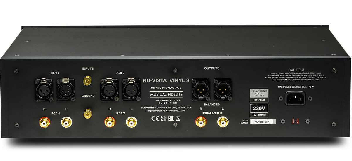 Każde z wejść RCA/XLR można osobno skonfigurować jako MM lub MC, z szerokim zakresem gain oraz przełączanym obciążeniem (pojemność/impedancja). Ustawienia zapamiętywane są per wejście. To pozwala perfekcyjnie dopasować Nu-Vista Vinyl S do praktycznie każdej wkładki.