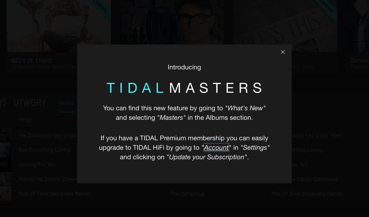 Do wspomnianych plików dostęp mają użytkownicy z abonamentem HiFi, którzy do tej pory mogli słuchać muzyki w jakości CD (44,1 kHz / 16 bit, przesyłana w kontenerze FLAC). Teraz, dzięki opcji Masters, ich wrażenia odsłuchowe będą o niebo lepsze. Wszystko to dzięki kodekowi MQA (Master Quality Authenticated) opracowanemu przez Meridian Audio specjalnie z myślą o usługach z muzyką na żądanie przesyłaną przez Internet w bardzo wysokiej jakości. Dzięki niemu usłyszmy takie dźwięki, jakie powstały w studiu nagraniowym. Kodek niweluje bowiem ograniczenia powstałe przy procesie kompresowania pliku i przywraca im jakość nagrania źródłowego.W bazie TIDAL-a znajdują się albumy, które w tej technologii można odsłuchać. Będzie ich tym więcej, im więcej będzie partnerów MQA.