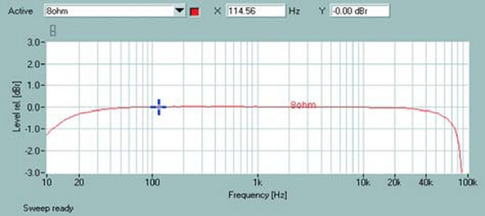 Pasmo przenoszenia (rys.1) poniżej 40Hz opada do -1,2dB przy 10Hz, podobnie sytuacja ma się powyżej 30kHz, punkt -3dB wyznaczymy na 86kHz.
