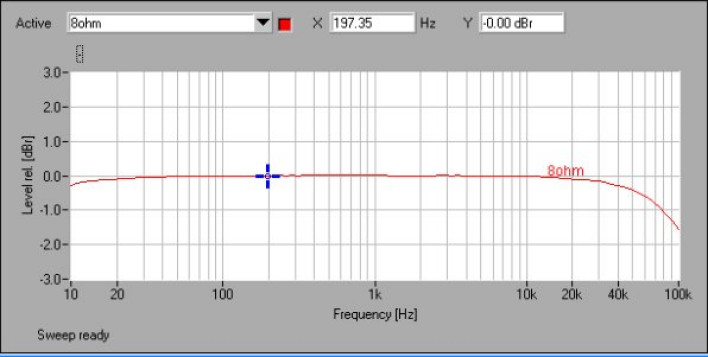 Pasmo przenoszenia na rys.1 nie daje powodów do najmniejszej krytyki, przy 10 Hz spadek wynosi -0,2 dB, a 100 kHz jest osiągane przy -1,6 dB.