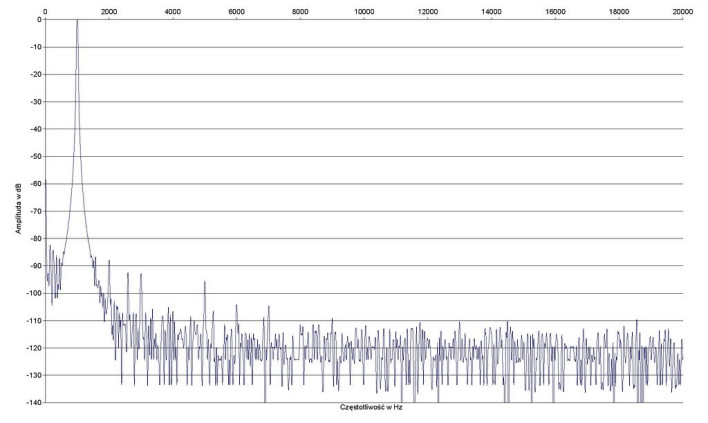 Poziom szumów to powtarzające się w tym teście 83 dB. Na rozkładzie harmonicznych (rys. 2) widać drugą, która delikatnie przebija się przez granicę -90 dB, pozostałe leżą już poniżej tego poziomu.