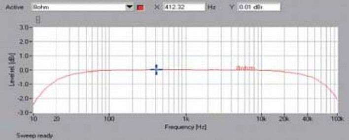 Pasmo przenoszenia (rys.1) ma wyraźnie zaznaczone spadki na obu skrajach, ale na szczęście nie przekraczające -3 dB, zarówno przy 10 Hz (-2,4 dB), jak i wysokich 100 kHz (-2,1 dB).