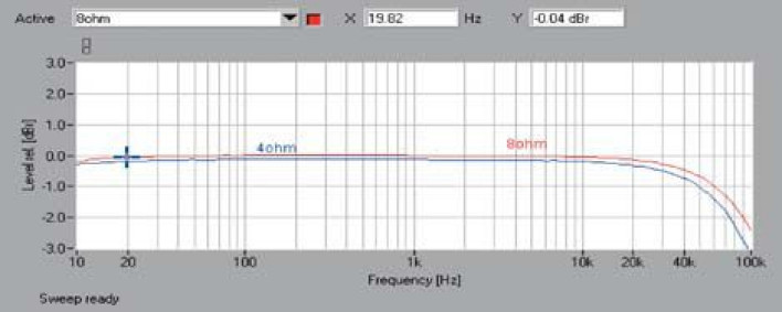 Do wpływu całej elektroniki cyfrowej (jaką naszpikowany jest nowoczesny amplituner) na poziom szumów zdążyliśmy się już przyzwyczaić - stąd mało porywający wynik 78 dB nie jest ani powodem do pochwał, ani do potępienia. Pasmo przenoszenia (rys. 1) pokazuje spadek -3 dB przed granicą 100 kHz, zarówno przy 8 jak i 4 omach. W dziedzinie poziomu i rozkładu zniekształceń (rys. 2) Sony prezentuje się wzorowo - trzecia harmoniczna musnęła zaledwie -90 dB i jest jedyną widoczną.