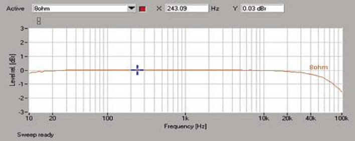 Odstęp od szumów plasuje się na niezłym poziomie -87 dB, dynamika osiąga 107 dB. Pasmo przenoszenia (rys. 1.) pokazuje świetną liniowość, przy 10 Hz wykres prezentuje się idealnie a spadek przy 100 kHz wynosi ok. -1,5 dB, po drodze nie ma najmniejszych niespodzianek.