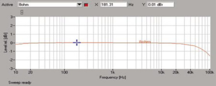 Denon potrafi wpompować w pojedyncze obciążenie 8-omowe aż 153 W albo 2 x 134 W albo 5 x 82 W. Idealnie prezentuje się czułość amplitunera - równe 210 mV. W tak ciepłych słowach nie można już, niestety, odnieść się do poziomu szumów, który osiąga -80 dB, dynamika wynosi 102 dB. Pasmo przenoszenia wygląda bardzo dobrze (rys. 1.), ze spadkiem tylko -1,6 dB przy 100 kHz.