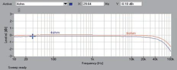 Rozbudowane urządzenie nie ustrzegło się problemów z wysokim szumem: stosunek S/N wynosi 82 dB, natomiast dynamika sięga już niezłych 104 dB. Pasmo przenoszenia (rys.1) rozciąga się od 10 Hz (z pomijalnym spadkiem) aż do 100 kHz przy -1,7 dB (8 omów) i -2,2 dB (4 omy). Spektrum zniekształceń (rys. 2.) jest dość czyste, trzecia harmoniczna sięga -87 dB, pozostałe są już znacznie słabsze.