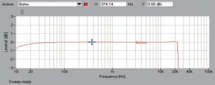 Pasmo przenoszenia (rys.1.) ma nieznaczny spadek przy 10 Hz (-0,8 dB), ale charakterystyka nagle "urywa się" tuż powyżej 20 kHz, wskazując na obecność jakiegoś filtra dolnoprzepustowego. Jest nim najprawdopodobniej przetwornik A/C (częstotliwość próbkowania 48 kHz) zastosowany w torze sygnałowym tuż za wejściami analogowymi. Mimo prób z różnymi ustawieniami i trybami, nie udało mi się jego wpływu wyeliminować. Prawdopodobnie, korzystając z wejść cyfrowych (HDMI) i pomijając tym samym konwersję, pasmo będzie jednak sięgać wyżej.