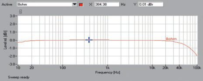 Pasmo przenoszenia (rys.1.) prezentuje się niemal idealnie przy 10 Hz (-0,3 dB), przy 100 kHz mamy spadek -2 dB.
