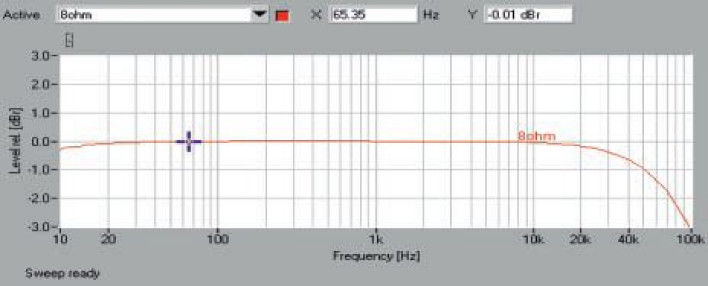 Pasmo przenoszenia z rys.1. nie ujawnia problemów, przy 10 Hz spadek wynosi -0,2 dB, a przy 100 kHz -3 dB. Spektrum zniekształceń (rys. 2) wygląda bardzo dobrze, żadna harmoniczna nie przekracza -90 dB, do tego poziomu zbliża się tylko trzecia.