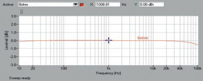 Wybornie przedstawia się pasmo przenoszenia (rys.1), liniowość jest nie tylko znakomita przy 10 Hz, przy 100 kHz spadek nie przekracza -0,6 dB.
