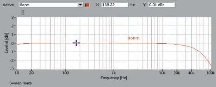 Ale dość wysoki (w porównaniu ze wzmacniaczami stereo) poziom szumów jest charakterystyczny dla amplitunerów w zasadzie bez względu na ich cenę... I tutaj Denon nie jest w stanie zrobić niczego nadzwyczajnego, S/N wynosi 81 dB. Dynamice, dzięki wysokiej mocy, udało się jednak przekroczyć pułap 100 dB. Pasmo przenoszenia (rys.1) prezentuje się wzorcowo przy 10 Hz (-0,1 dB), powyżej 20 kHz rozpoczyna się spadek, ale dla 100 kHz nie przekracza -2,5 dB.